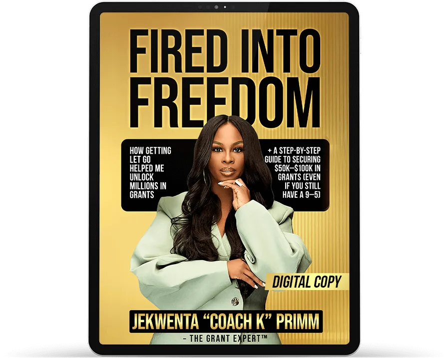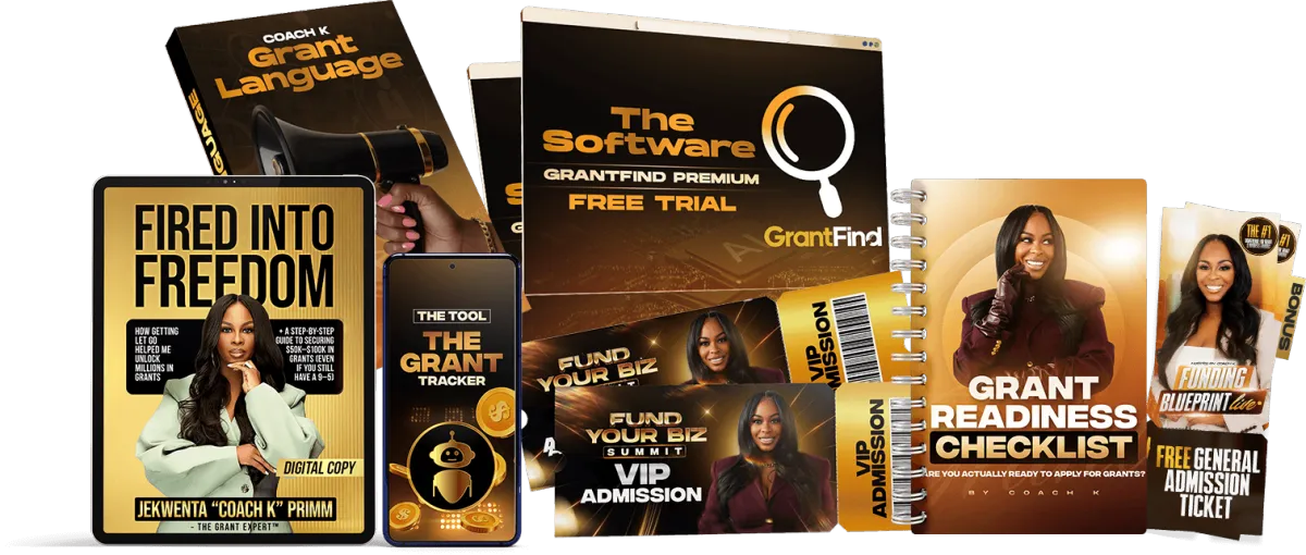 Get immediate access to Coach K’s most trusted funding resources, including the Fired to Freedom Grant Book (digital copy), the Grant Tracker tool, and a free trial of GrantFind Premium, designed to help you organize, track, and move forward with confidence.
